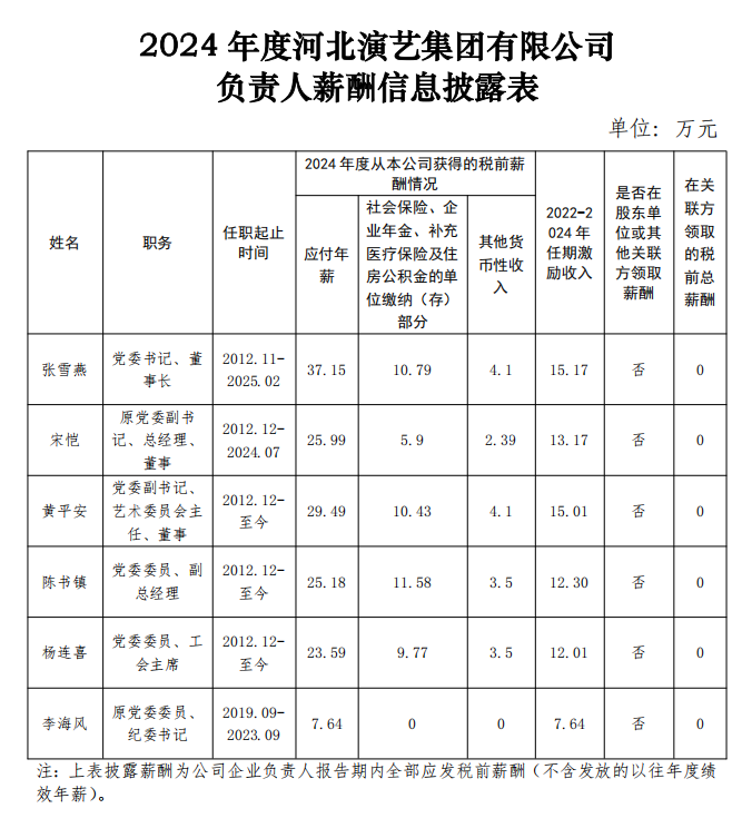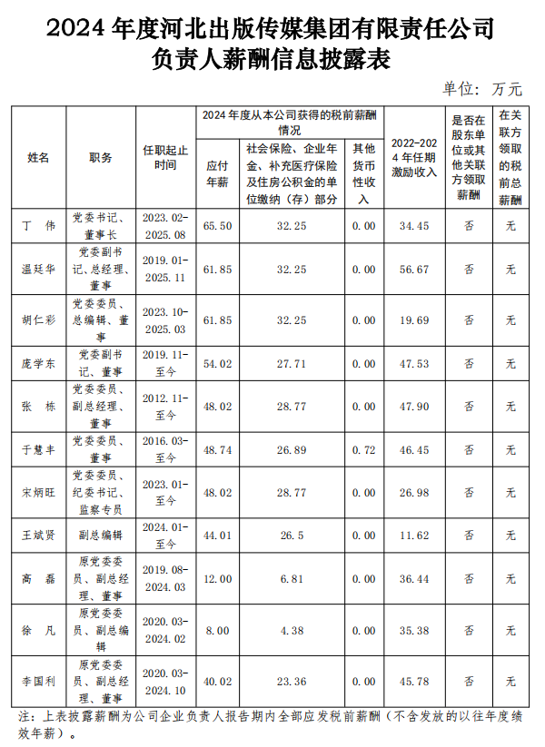 按照《中共河北省委河北省人民政府印发<关于深化省属国有企业负责人薪酬制度改革的实施意见>的通知》(冀发〔2015〕13号)规定,现将“河北省省级文化企业国有资产监督管理领导小组办公室”监管企业2024年度负责人薪酬信息披露如下: